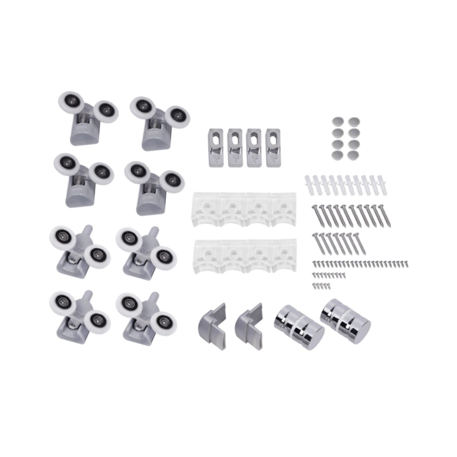 Піддон, подвійні ролики, ручки, комплект кріплень, глухе скло, скляні двері, профіль, ніжка.