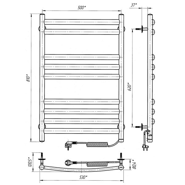 Рушникосушарка – 1 шт, кріплення (шуруп оцинкований з дюбелем, п'ятак, втулка, штифт, стійка) - 4 шт, ключ шестигранний – 1 шт, упаковка (короб картонний, чохол поліетиленовий, чохол поліетиленовий для кріплення, коробочка для кріплень) – 1 шт, паспорт – 1 шт.