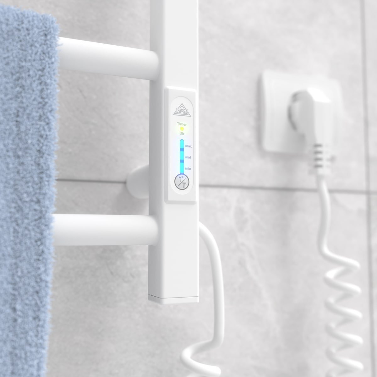 Особливості: керує нагрівом електрорушникосушарки мікропроцесорний термоконтроллер (кнопкове управління). Для початку роботи необхідно задати температуру рушникосушарки. Термодатчик контролює температуру поверхні рушникосушарки, що виключає можливість її перегріву. Серед переваг регулятора - зберігання обраного режиму роботи (при відключенні робота відновитися в запрограмованому користувачем режимі), наявність таймера відключення (3h) і колірної індикації роботи!