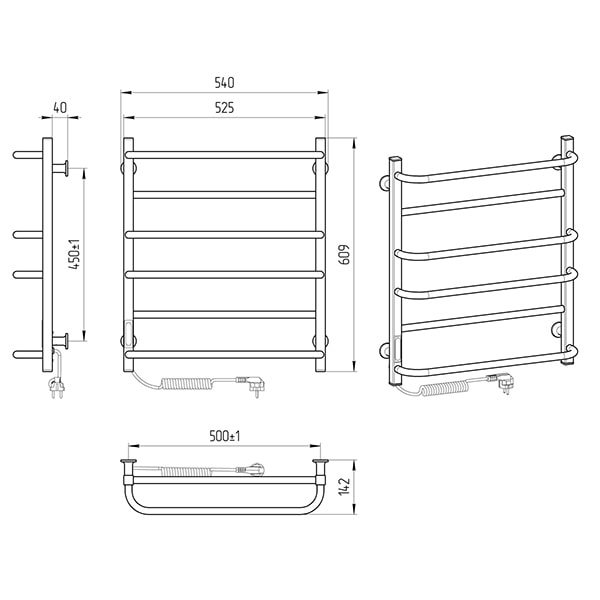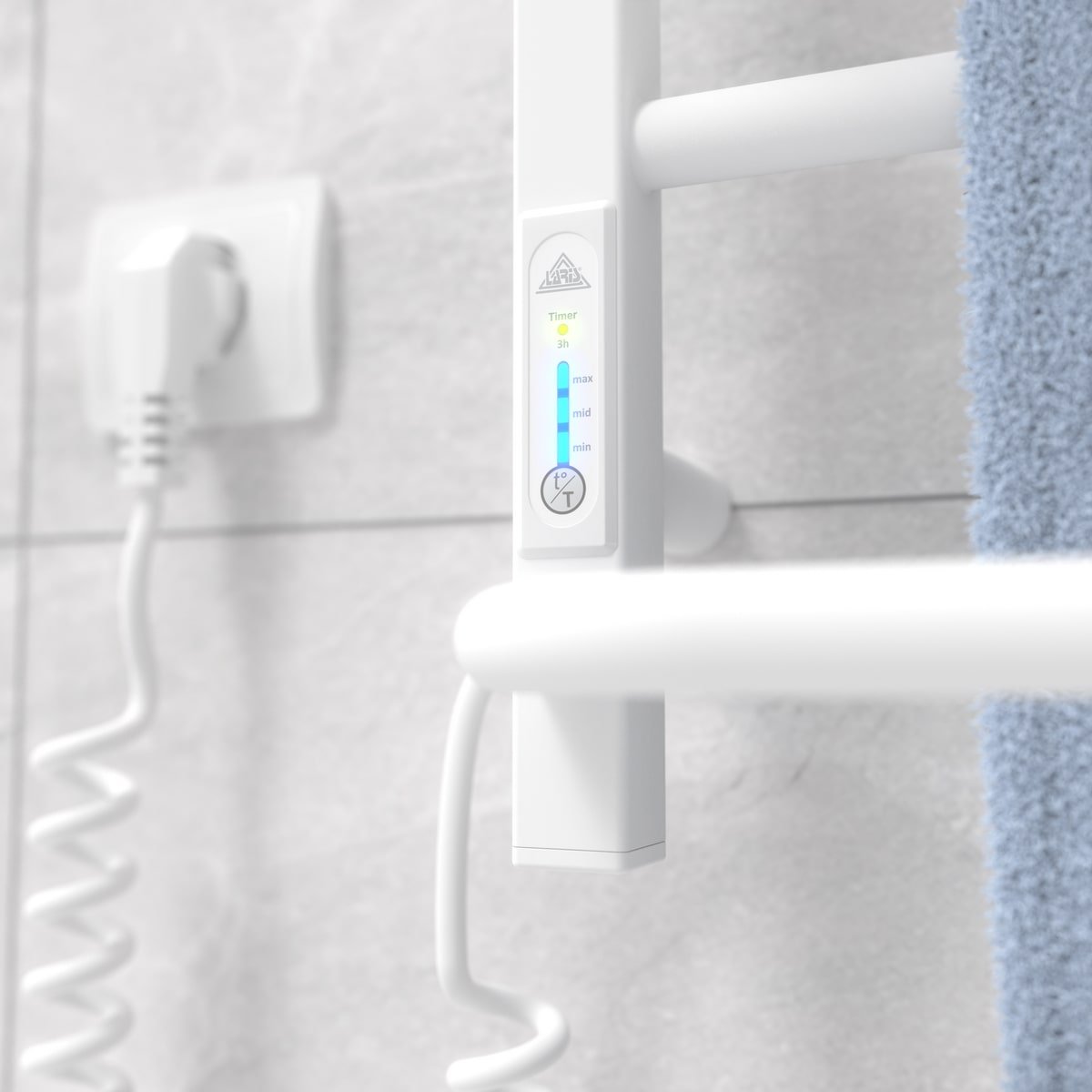 Особливості: керує нагрівом електрорушникосушарки мікропроцесорний термоконтроллер (кнопкове управління). Для початку роботи необхідно задати температуру рушникосушарки. Термодатчик контролює температуру поверхні рушникосушарки, що виключає можливість її перегріву. Серед переваг регулятора - зберігання обраного режиму роботи (при відключенні робота відновитися в запрограмованому користувачем режимі), наявність таймера відключення (3h) і колірної індикації роботи!