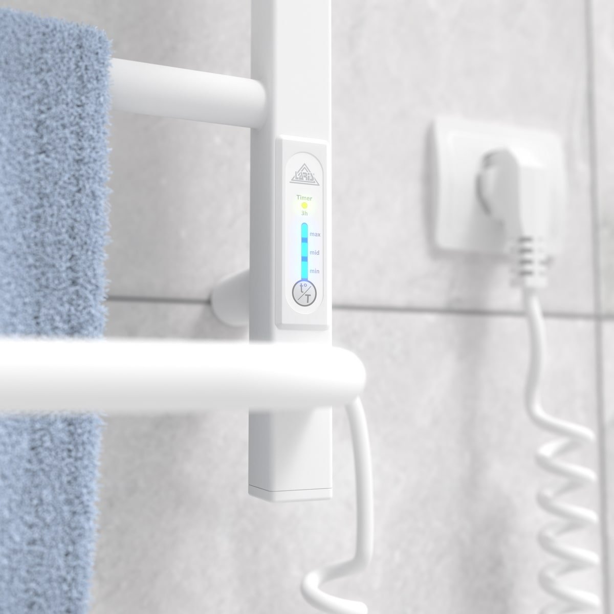 Особливості: керує нагрівом електрорушникосушарки мікропроцесорний термоконтроллер (кнопкове управління). Для початку роботи необхідно задати температуру рушникосушарки. Термодатчик контролює температуру поверхні рушникосушарки, що виключає можливість її перегріву. Серед переваг регулятора - зберігання обраного режиму роботи (при відключенні робота відновитися в запрограмованому користувачем режимі), наявність таймера відключення (3h) і колірної індикації роботи!