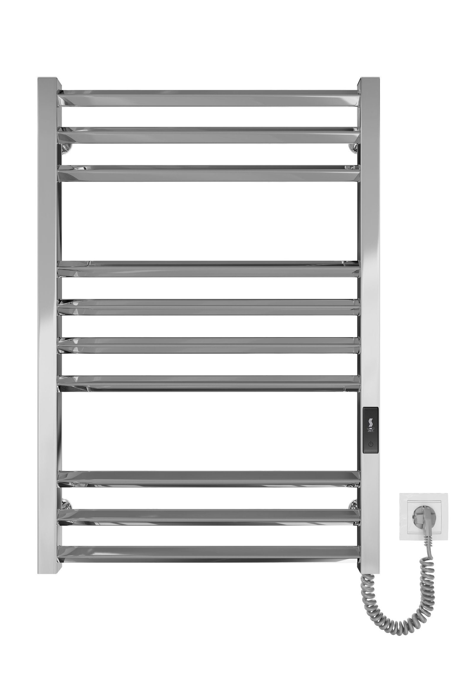 Бытовая электрическая полотенцесушилка Рушникосушка Кіото-I 770х530/80 TR К 2.0. Оснащена таймер-регулятором и коннектором для подключения к розетке с любой стороны. Совместима с комплектом скрытого подключения. Имеет 10 перекладин и стойки. Изготовлена из полированной нержавеющей стали без хромирования. Температурные режимы таймер-регулятора: 40°С, 45°С, 50°С. Варианты времени работы: 3, 6 часов и постоянный нагрев. Мощность [3 Вт]. Для удобства использования можно дополнительно оснастить навесными крючками. Гарантия — 20 років на корпус / 5 років на електричну частину.