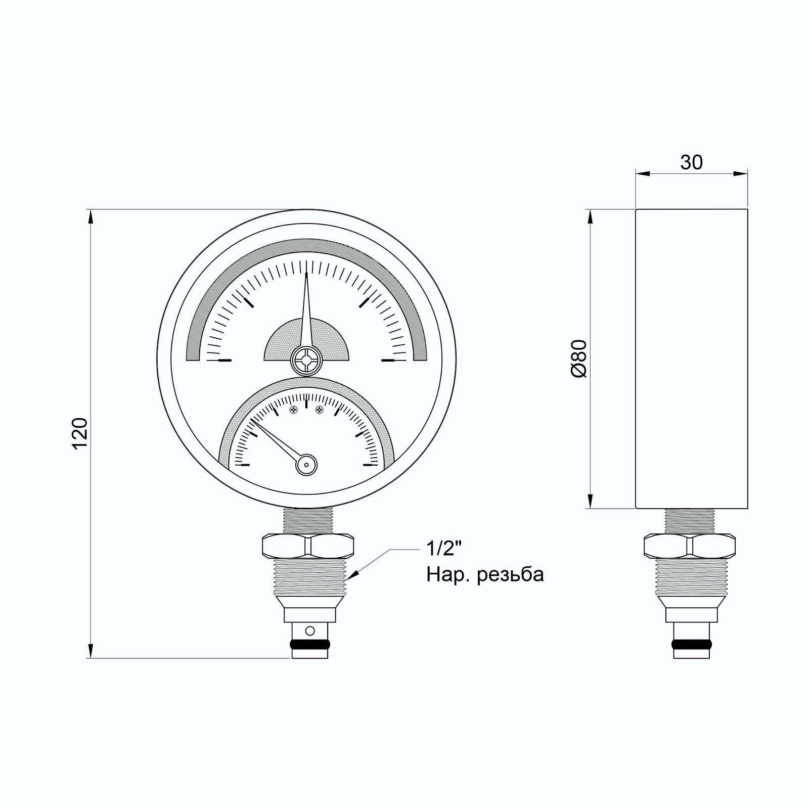 Термоманометр Thermo Alliance Standart 80 мм 1/2", заднее подключение SD1724B - комбинированный прибор для одновременного измерения и контроля давления, и температуры. Термоманометр конструктивно объединяет в себе два прибора: манометр и термометр в одном корпусе, имеет две шкалы - давления и температуры.