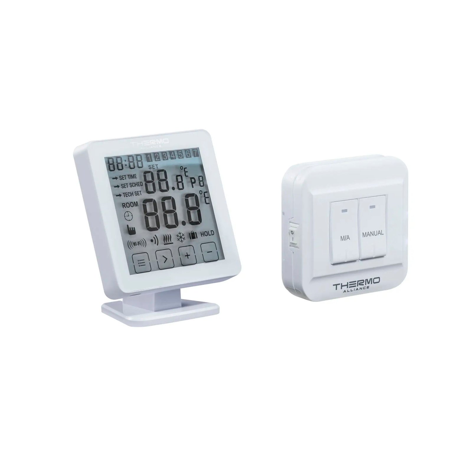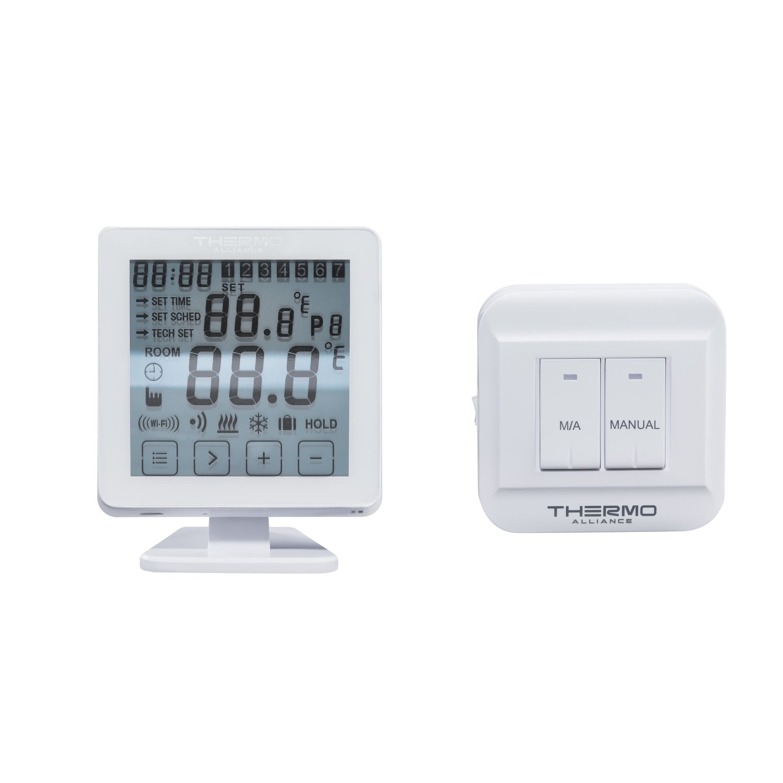 Недельный программируемый термостат Thermo Alliance ТА-2701Wi-Fi RF имеет два блока: блок управления отопительным прибором (включение/отключение) и блок комнатного термостата, он используется в качестве графического интерфейса пользователя для определения и контроля температуры в помещении. Оба блока поддерживают связь радиочастотами (RF). Функция "Wi-Fi" позволяет дистанционно управлять устройством с помощью мобильного приложения ThermoAllianceSmart.