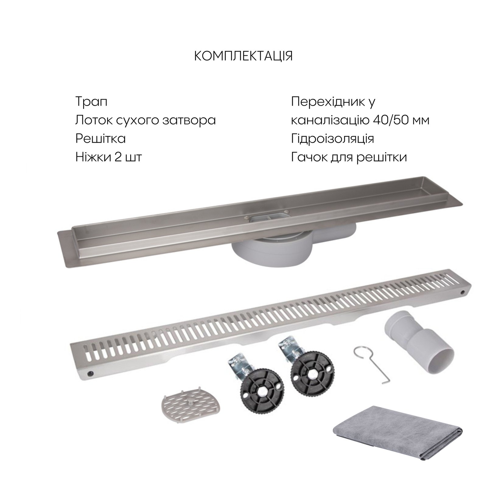 Трап, лоток сухого затвора, ґрати, ніжки (2 шт), перехідник у каналізацію 40/50 мм, гідроізоляція, гачок для ґрат.