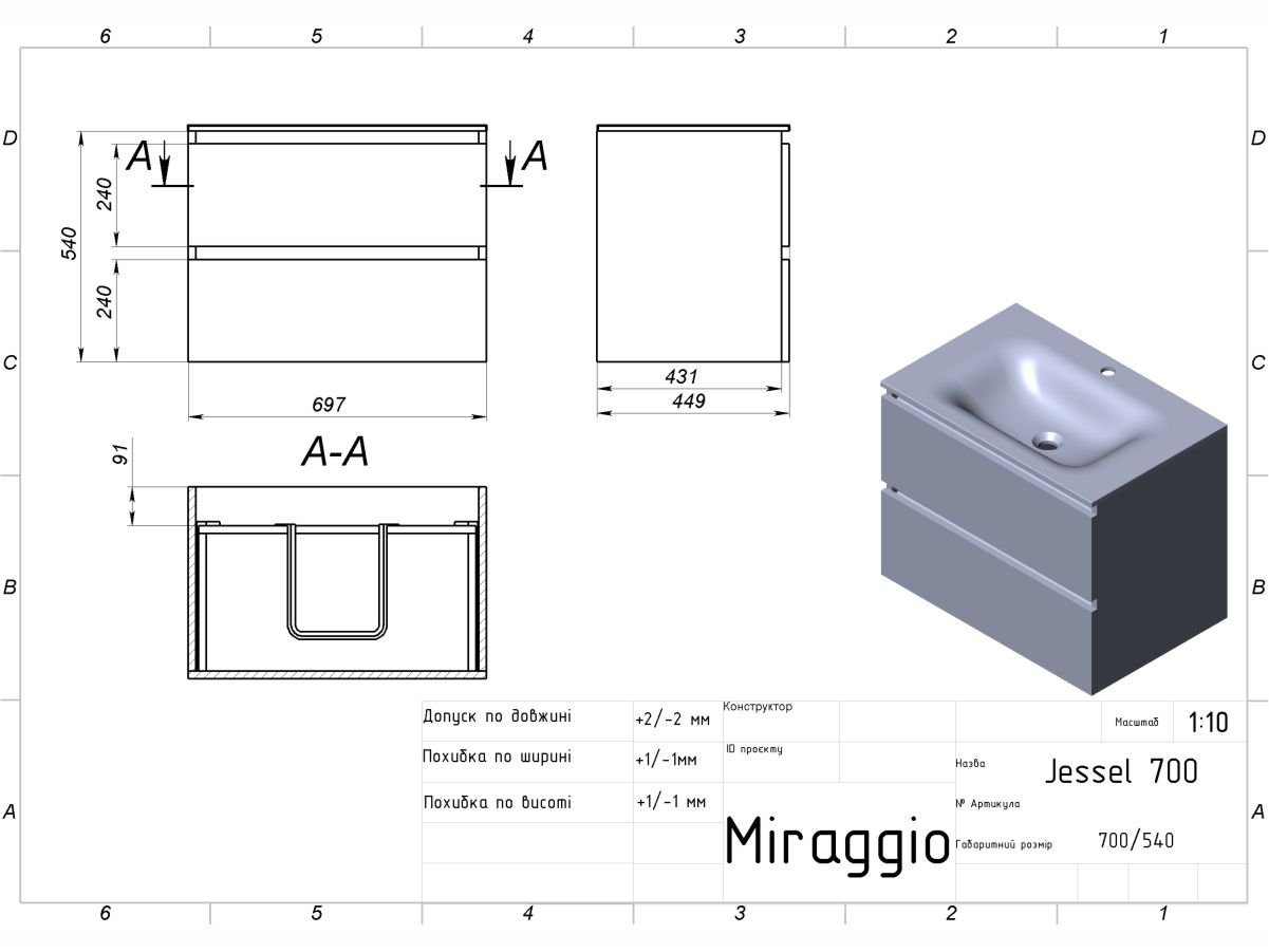 Ширина виробу — 697 мм робить модель зручною для приміщень різної площі. Спосіб відчинення шухляд у даній моделі тумби - За фасад.