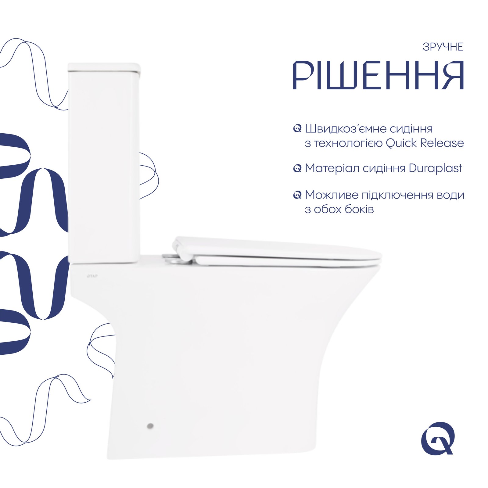 Унитаз-компакт Qtap Presto Quadro с сиденьем QT24221215AW имеет классический дизайн, поэтому будет уместен в любом современном интерьере. Чаша унитаза безободковая, что исключает скопление лишней грязи и позволяет очистить изделие без особых усилий. Сиденье с функцией Soft-close опускается плавно и бесшумно. Специальное гигиеническое крепление Quick release позволяет максимально быстро снять или установить сиденье на унитаз. Изделие изготовлено из керамики белого цвета и покрыто защитной эмалью.