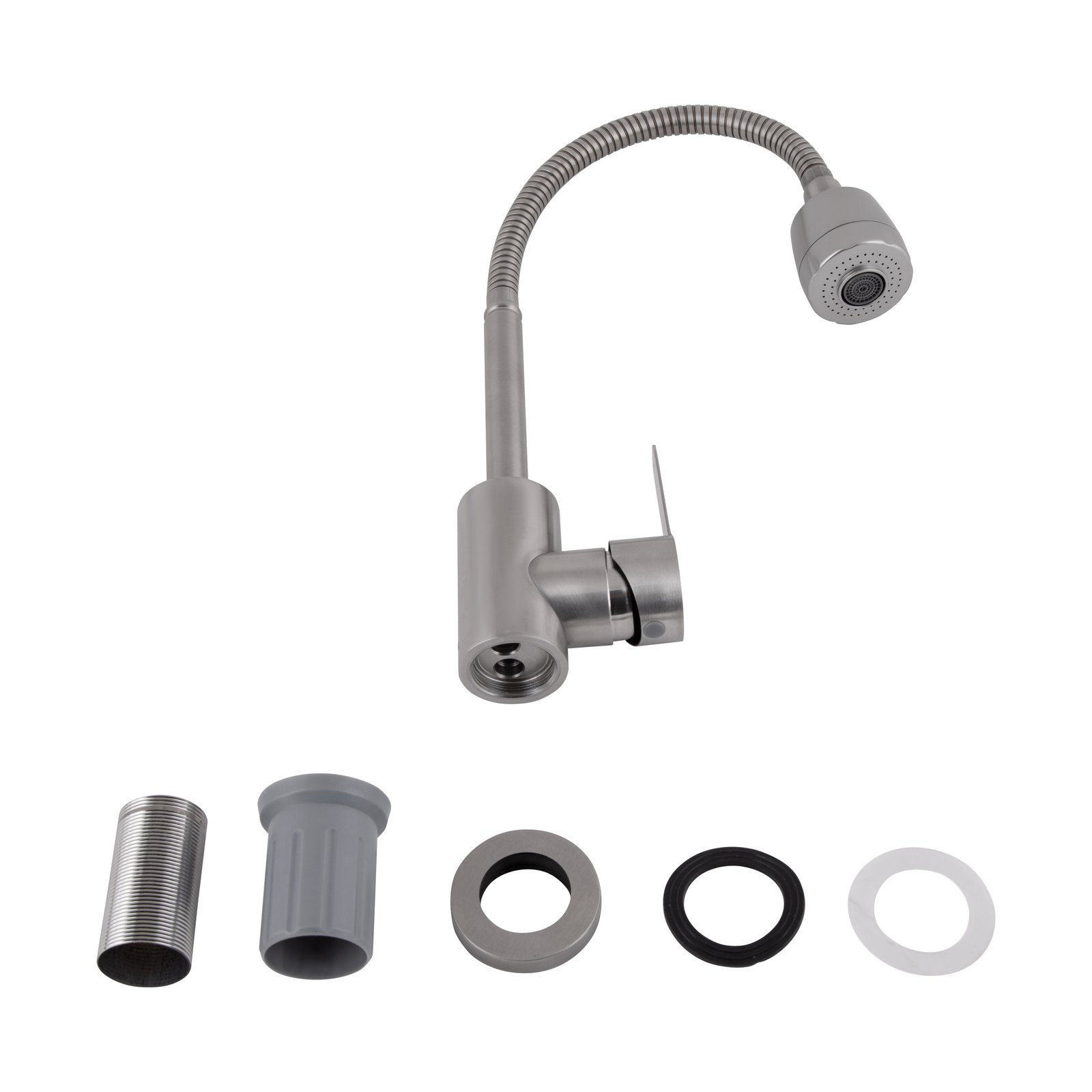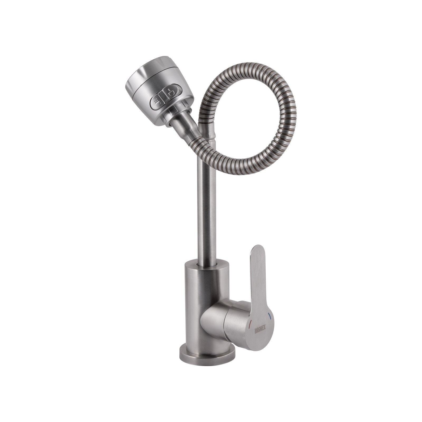 Смеситель для кухни Brinex Pure 015F41 с гибким изливом Nickel – универсальное решение для кухни. Гибкий излив позволяет легко направить поток воды в нужное место. Никелевое покрытие устойчиво к повреждениям и коррозии. Надежный керамический картридж обеспечивает плавную работу.