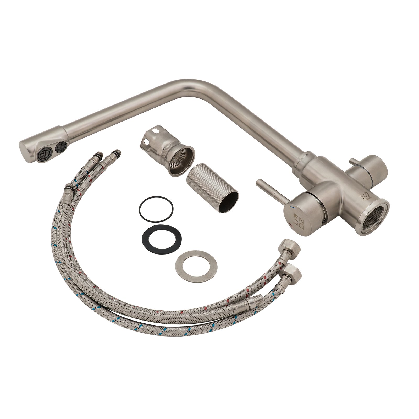 Смеситель для кухни с фильтром Lidz (NKS) 12 32 020F-13 изготовлен из нержавеющей стали. Благодаря никелированной брашированной поверхности имеет оригинальный внешний вид. Выполнен в современном стиле, в котором предусмотрены 2 излива: вода для бытовых расходов, а также с фильтром для питьевой воды. Такой смеситель имеет дополнительный рычаг, позволяющий переключать режим на подачу питьевой воды. Он не только удобен и практичен, но и станет идеальной находкой на кухне.
