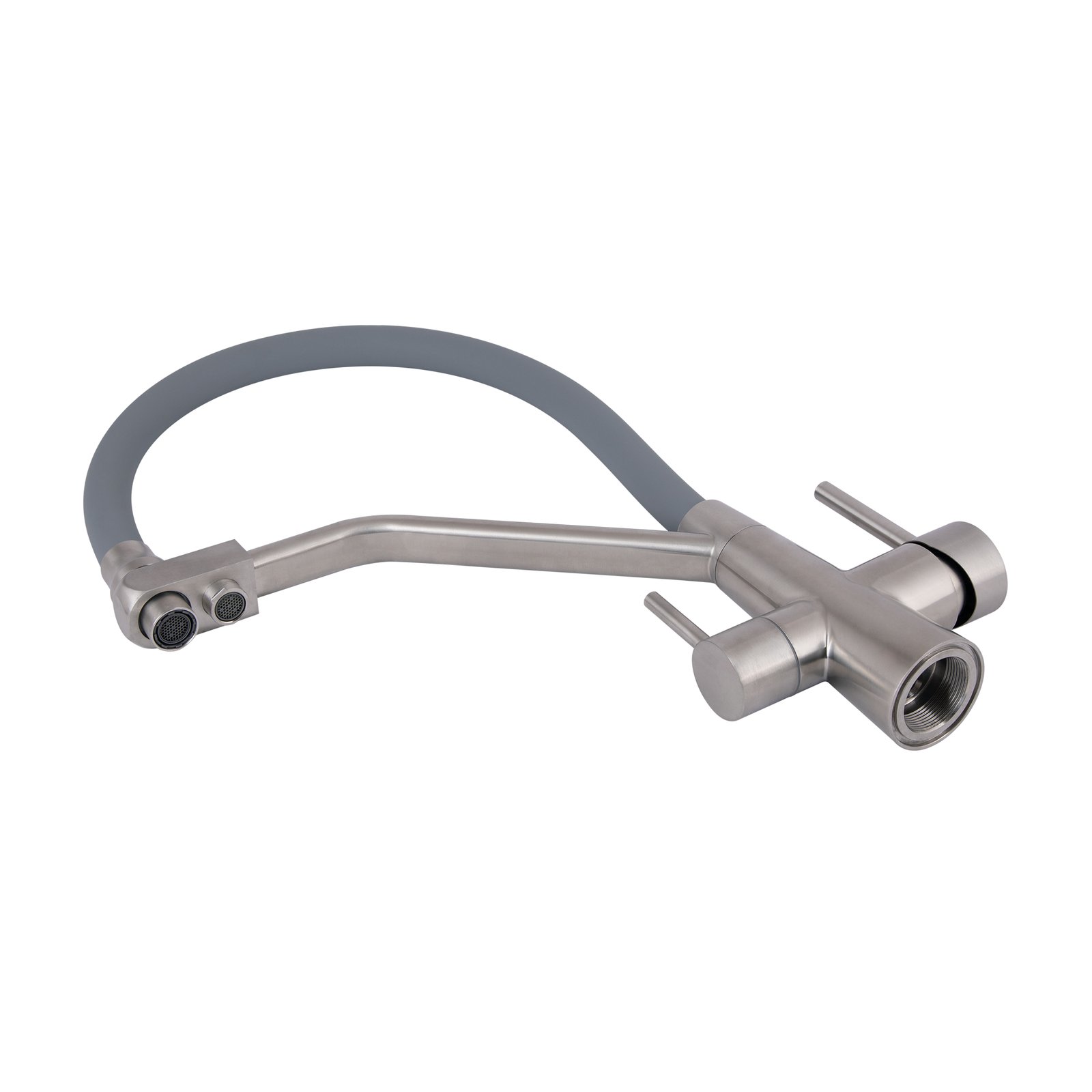 Смеситель для кухни Lidz Aria 020F3 с гибким изливом с подключением для питьевой воды (k35) Grey / Nickel сочетает в себе функциональность гибкого излива и возможность подключения питьевой воды. Гибкий излив облегчает управление направлением потока воды, а качественные материалы обеспечивают долговечность и надежность в эксплуатации.